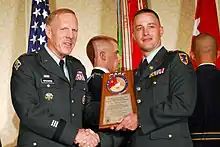 2LT Joseph Pittard of 89th Transportation Company, 6th Transportation Battalion, 7th Sustainment Brigade receives an award for his Unit's Deployment Excellence.