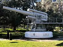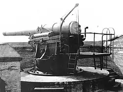 The M1888 8 in (203 mm) gun was a coastal artillery gun initially deployed as part of the Endicott system of fortifications. The first nine were deployed on the M1892 barbette carriage in 1898, but the improved M1894 and M1896 disappearing carriages soon became available, and approximately 64 additional weapons were deployed on these carriages by 1908. An "emergency" converted Rodman carriage was also used during the Spanish–American War in 1898 to quickly arm 21 emplacements with the modern 8-inch M1888 gun.[4][5] These weapons were redeployed soon after the war ended. The disappearing carriage allowed the gun to remain behind a parapet resembling a hillside most of the time, thus largely invulnerable to low-angle enemy fire, which was the only type of enemy attack anticipated 1898–1910. Air and high-angle artillery attack would eventually severely impact US fortifications in the Philippines in World War II. Numerous additional weapons of other calibers including the 10-inch gun M1895, 12-inch gun M1895, and 12-inch coast defense mortars were also deployed in US coastal fortifications alongside the 8-inch guns. The 8-inch guns were deployed in the harbor defenses of Portland, Maine, Portsmouth, New Hampshire, New Bedford, Massachusetts, Long Island Sound, New York, Eastern New York, Southern New York, Delaware River, Baltimore, Maryland, Potomac River, Chesapeake Bay, Cape Fear River, North Carolina, Savannah, Georgia, Key West, Florida, Tampa Bay, Florida, Pensacola, Florida, Mobile, Alabama, Mississippi River, Galveston, Texas, San Francisco, California, Columbia River, and Puget Sound.[6]