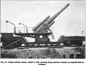 After the American entry into World War I, the United States needed a medium-range heavy artillery piece that could be transported easily. The quick solution was to take the existing 8-inch coast artillery guns from the fixed mountings or from storage and mount them on a drop bed rail car.[7] This was also done with a number of other weapons, including 10-inch (254 mm) guns, 12-inch (305 mm) guns, and 12-inch mortars. The 7-inch (178 mm) guns, 8-inch guns, and 12-inch mortars used a common carriage, with a depressed center and two 4-wheel or 6-wheel bogies. The bogies were interchangeable for standard gauge or (with 12-wheel bogies) 60 cm (23.6 in) gauge track. Outriggers and a rotating mount allowed all-around fire. This allowed the weapons to be used in coast defense against moving targets. A detailed description of the railway mounting is given in Railway Artillery, Vol. I by Lt. Col. H. W. Miller, USA.[8] A total of 96 8-inch guns (reportedly including spare Navy Marks 1 through 4 as well as M1888 guns) were considered available for railway mounting, and 47 were ordered to be mounted on railcars. Twenty-four were produced before the Armistice, and three of these had been shipped to France by that time.[2][9][10] These three and several 10-inch guns were the only US Army railway guns shipped to France in World War I, although five US Navy 14"/50 caliber railway guns (356 mm) saw action.