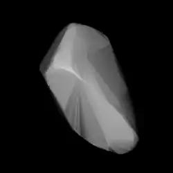 Lightcurve inversion also modeled the body's shape and poles. In 2013, modelling by an international study using photometric data from the US Naval Observatory, the Uppsala Asteroid Photometric Catalogue, the Palomar Transient Factory and the Catalina Sky Survey gave a concurring sidereal period of 7.37390±0.00002 hours and two spin axes of (325.0°, 23.0°) and (132.0°, 26.0°) in ecliptic coordinates (λ, β). The body's very elongated shape had already been indicated by the relatively high brightness variation measured during the direct photometric observations.[5][19]