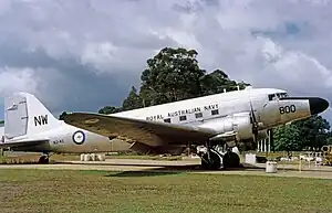 ![]() Douglas C-47 Dakota of 851 Squadron after retirement. It has the nose radar of a Sea Venom for training purposes | |