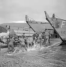 The Torch landings began on 8 November 1942, and First Army's units and formations were progressively fed into the fighting. V Corps' Advanced HQ and some of its divisions arrived on 22 November, but 4th Division was still in the UK: 91st LAA Rgt was photographed undergoing a combined operations training exercise in Scotland on 17 November.[11] 4th Division did not sail from the UK until 12 March 1943, landing on 23 March and reaching the front between 3 and 6 April in time for the final phases of the fighting in the Tunisian Campaign.[9][12]