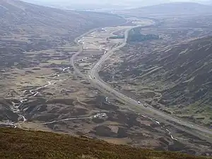 The less well defined eastern ridge descends steeply from Bruach nan Iomairean to a col with a height of approximately 655 metres which links to the hill the Boar of Badenoch also known as An Torc. The line of old fence posts can be followed the whole way. The Boar reaches a height of 739 metres and is a Graham Top. It is a fine viewpoint down into the Pass of Drumochter.[7]