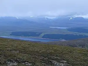An alternative start is at Balsporran cottages (NN627791), and offers a direct ascent up the NE ridge or a longer walk which takes in the adjoining Munro of Geal-chàrn. The summit is marked by a substantial collection of stones which has been shaped in to a wind shelter rather than the usual cairn. The view includes Loch Ericht and Loch Pattack to the NW and the Ben Alder massif.[10]