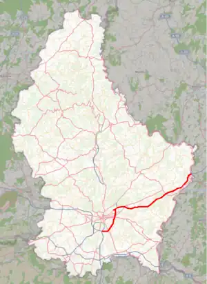 The Autoroute 1, abbreviated to A1 or otherwise known as the Trier motorway (Luxembourgish: Tréierer Autobunn, French: Autoroute de Trèves), is a motorway in Luxembourg. It is 36.203 kilometres (22.496 mi) long and connects Luxembourg City, in the south, to Wasserbillig, in the east. A few hundred metres to the north of Wasserbillig, it reaches the German border, whereupon it becomes the A64, which leads to Trier.