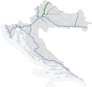 The A4 motorway (Croatian: Autocesta A4) is a motorway in Croatia spanning 97.0 kilometres (60.3 mi).[1] It connects the nation's capital, Zagreb, to the city of Varaždin and to Budapest, Hungary via the Goričan border crossing.[2] The motorway represents a major northsouth transportation corridor in Croatia and is a part of European routes E65 and E71.[3] The A4 motorway route also follows Pan-European corridor Vb.[4]