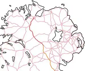 ![]() The route of the A5 in red linking Derry city and Aughnacloy, County Tyrone). The continuation of this route in the Republic of Ireland, the N2, is shown in orange. | |
