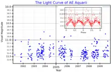 A visual band light curve for AE Aquarii. The main plot shows the long term variability, and the inset plot shows the short term variability over one orbital period. Adapted from Šimon (2020).[12]