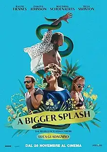 A Bigger Splash is a 2015 psychological drama film directed by Luca Guadagnino and with a screenplay by David Kajganich from a story by Alain Page. Starring Tilda Swinton, Matthias Schoenaerts, Ralph Fiennes, and Dakota Johnson, the film is loosely based on the 1969 Jacques Deray film La Piscine[3] and named after the 1967 David Hockney painting of the same name.[4] It is the second installment in Guadagnino's self-described Desire trilogy, following I Am Love (2009) and preceding Call Me by Your Name (2017). It competed for the Golden Lion at the 72nd Venice International Film Festival.[5][6]