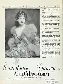 A Bill of Divorcement is a 1922 British silent drama film based on Clemence Dane's play A Bill of Divorcement. The film was directed by Denison Clift and stars Constance Binney, Fay Compton and Malcolm Keen.[1][2]
