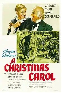 Made by Metro-Goldwyn-Mayer and originally intended to star Lionel Barrymore (who played the role of Scrooge annually on radio but was forced to drop out of the film because of his arthritis, though he narrated its trailer),[2] the movie starred Reginald Owen as Scrooge and the married couple Gene and Kathleen Lockhart as the Cratchits. Terry Kilburn costarred as Tiny Tim and a young June Lockhart (Gene and Kathleen's daughter) made her screen debut as one of the Cratchit daughters.[3] Leo G. Carroll played Marley's Ghost. The characters of Fred (Scrooge's nephew) and Elizabeth, his fiancée (his wife in the novelette), were greatly expanded in order to work in a romantic angle to the story that Dickens did not intend. The couple was played by Barry MacKay and Lynne Carver. Ann Rutherford, better known as Polly Benedict in the MGM Andy Hardy film series and as Carreen O'Hara in Gone with the Wind, was a young and attractive Ghost of Christmas Past, rather than the somewhat unusual creation that Dickens described.