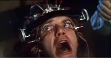 During the filming of the Ludovico technique scene, McDowell scratched a cornea[20] and was temporarily blinded. The doctor standing next to him in the scene, dropping saline solution into Alex's forced-open eyes, was a real physician present to prevent the actor's eyes from drying. McDowell also cracked some ribs filming the humiliation stage show.[21] A unique special effect technique was used when Alex jumps out of the window in a suicide attempt, showing the camera approaching the ground from Alex's point of view. This effect was achieved by dropping a Newman-Sinclair clockwork camera in a box, lens-first, from the third storey of the Corus Hotel. To Kubrick's surprise, the camera survived six takes.[22]