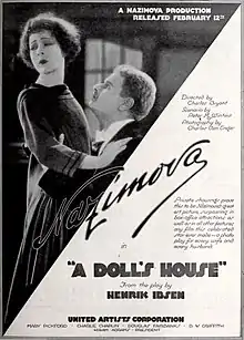 A Doll's House is a 1922 American silent drama film produced by and starring Alla Nazimova and directed by her husband Charles Bryant. The couple released the film through United Artists. It is based on the 1879 play A Doll's House by Henrik Ibsen with the scenario written by Nazimova under the pseudonym Peter M. Winters. The film was the fourth silent version filmed of the play, being preceded by a 1918 Paramount film directed by Maurice Tourneur. The film is classified as being lost.[1][2][3][4]