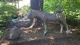Brad Rude's A Donkey, 3 Rocks, and a Bird. (1992), installed at Catlin Gabel School between the Lower School's science room and the Art Barn,[1] is a cast bronze and stone sculpture depicting a life-size donkey and a bird facing one another. The donkey has a rock balanced on its back, while the bird is both standing on a rock and balancing one on its head. The donkey has surfaces decorations, including glyphs and figures, and is coated in polychrome bronze. The bird is coated in blue, green, orange, red and yellow.[2] The sculpture measures approximately 55 inches (1.4 m) x 108 inches (2.7 m) x 20 inches (0.51 m). Its base is made of exposed aggregate concrete and measures approximately 10 inches (0.25 m) x 108 inches (2.7 m) x 20 inches (0.51 m). One plaque on the base reads, "A DONKEY / 3 ROCKS, / AND A BIRD." / BY BRAD RUDE '92. Another reads, Donkey, Bird and Rocks / by Brad Rude / Cast Bronze / a gift from / Dori Schnitzer '71 and Susan Schnitzer '74 / A CAMPAIGN FOR CATLIN GABEL / Breaking Ground for the 21st Century / September 1992.[2] Inscriptions near the donkey's crotch displays the artist's last name, a copyright symbol, and the year of completion, plus the founder's mark for Will Willie. The Smithsonian Institution describes the work as abstract. Its condition was deemed "well maintained" by Smithsonian's "Save Outdoor Sculpture!" program in November 1993.[2]