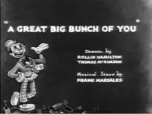 A Great Big Bunch of You is a 1932 Warner Bros. Merrie Melodies cartoon, directed by Rudolf Ising.[1] The short was released on November 12, 1932.[2] A ventriloquist's dummy in the city dump improvises a piano, from the junk there, to play and sing the title song, "A Great Big Bunch Of You", by Mort Dixon and Harry Warren.[3][4][5][6] The various animals and animated junk perform in segued vignettes.