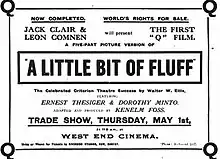 A Little Bit of Fluff is a 1919 British silent comedy film directed by Kenelm Foss and Geoffrey H. Malins and starring Ernest Thesiger, Dorothy Minto and Bertie Wright. The film is an adaptation of the popular stage farce of the same name by Walter W. Ellis.[1] Ernest Thesiger reprised his stage success as Bertram Tully, as did Alfred Drayton (Dr. Bigland) and Stanley Lathbury (Nixon Trippet).[2] The play was filmed again in 1928.[3] The 1919 version was made at the Kew Bridge Studios in London.