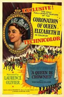 A Queen Is Crowned is a 1953 British Technicolor documentary film written by Christopher Fry. The film documents the 1953 Coronation of Queen Elizabeth II, with a narration of events by Laurence Olivier. It was nominated for the Academy Award for Best Documentary Feature and was the first winner of the now-defunct Golden Globe Award for Best Documentary Film.[2][3][4] The film was one of the most popular at the British box office in 1953.[5]