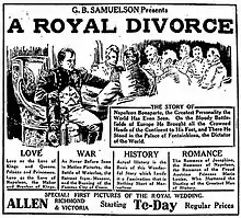 A Royal Divorce is a 1923 British silent historical drama film directed by Alexander Butler and starring Gwylim Evans, Gertrude McCoy and Lillian Hall-Davis.[1] [2] It was based on a play by C.C. Collingham and depicts the romantic relationship and political divorce between Napoleon and his wife Josephine. It reportedly did well at the box office when released in the United States, possibly reflecting the strategy of casting an American star McCoy in a leading role.[3] It was remade as a sound film, A Royal Divorce, in 1938.