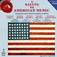 A Salute to American Music is a 113-minute live album of music, both classical and popular, performed by Steven Blier, Renée Fleming, Paul Groves, Jerry Hadley, Karen Holvik, Marilyn Horne, Jeff Mattsey, Robert Merrill, Sherrill Milnes, Maureen O'Flynn, Phyllis Pancella, Leontyne Price, Samuel Ramey, Daniel Smith, Frederica von Stade, Tatiana Troyanos, Carol Vaness and Denise Woods with the Collegiate Chorale and members of the Metropolitan Opera Orchestra under the direction of James Conlon. The album was released in 1992.