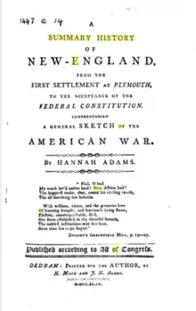 A Summary History of New-England is an 18th-century history book regarding New England by the American author, Hannah Adams. It was first published in Dedham, Massachusetts in 1799, by Herman Mann and James H. Adams, and followed her A View of Religions, which was published in 1784. Not arrogating to herself the honors of an original historian, Adams exonerated herself from a large share of responsibility, and at the same time earned considerable merit by the judicious use which she has made of the labor of others. She included or abridged their accounts, as occasion demanded.[1]
