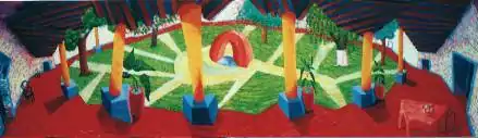 In his review of the show, Espace/Paysage, Galerie Sud, Centre Georges Pompidou, in Paris, Joe Lockard observed that the space of the landscape in Hockney’s other paintings is successfully extended to an interior. He says, “Hockney attempts and achieves panoramic interior compositions that distinguish his vivid experimentalism.”[2]