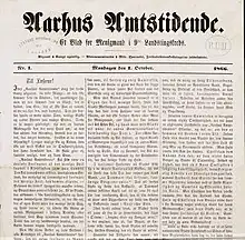 The first issue of Aarhus Amtstidende was published on 1 October 1866.[1][2] Its founders were Lars Bjørnbak, a leftist figure, and JCN Wistoft, a merchant.[3][4] The reason for the establishment of the paper was Lars Bjørnbak's opposition to the constitutional revision carried out in the same year.[4] Bertel Jensen was the editor of the paper.[4] During its early years the paper was a leftist and polemical publication and defended the interests of the masses.[3][4] Therefore, it gained popularity among rural people.[4] Its rival was the conservative newspaper Århus Stiftstidende.[4] In the 1890s, Aarhus Amtstidende became more versatile, but it again adopted its polemical style in the 1920s.[3] This polemical stance led to a decrease in its circulation.[3]