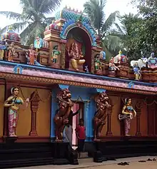 The architectural style of the temple is similar to the temples of Tamil Nadu. The outer wall and gopuram are decorated and adorned by colorful sculptures of different Hindu deities like Ganesha, Ayyappan, Vishnu, Kartikeya and Hanuman. The shrines of the principal deity and other subordinate deities are also vibrant, with carvings, murals and decorations.[5]