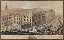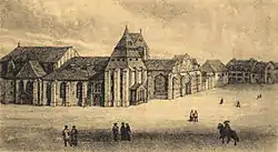 The abbess Françoise-Lucie de Montmorin described the poor state of the monastery to King Louis XVI of France (1754–93), who in 1776 agreed to make a large donation for its reconstruction.[2] The architect Louis de La Brière of Paris was assigned the work. On 30 April 1778 the first stone was laid with great pomp by the Marquise de Montmorin, acting for the king's aunt Victoire (1733–99).[9] Funding ran out in 1781 and the work stopped. Of the four buildings planned by La Brière only the north one was completed. The building looking over the Place Notre-Dame was incomplete, and the two projecting wings were reduced in size.[13]