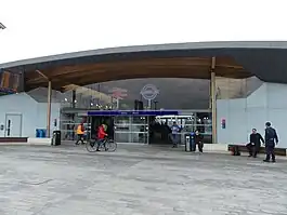 The station has been rebuilt twice over the past 50 years to cater for the changing nature of the area.[5] In 1987 a new station was constructed which, in 2014, was replaced by Network Rail with an interim station whilst the new Crossrail station was constructed. The new station opened on 23 October 2017.[6] It was designed by architects Fereday Pollard and includes step free interchange between platforms and bus connections with the Harrow Manorway, a dual carriageway which runs next to the ticket hall.[7]