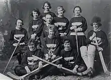 The first mention of a women's ice hockey game occurred in Medicine Hat in 1897.[24] Two years later, the Edmonton Ladies Hockey Team was the first Canadian women's hockey team to endorse a commercial product. In an 1899 team photo, the Ladies Club is pictured lacing up Starr Acme Club skates.[25] In the winter of 1937, intergender matches were contested in Alberta. A ladies club from Nanton, Alberta was formed and they defeated a local men's club by a 3–2 score.[26]