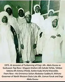 [1]Abdu Gusau, Garkuwan Sokoto, MBE, OON (1918–1994), was a Nigerian civil engineer, and statesman[2] who served as the Garkuwa of Sokoto until his death in 1994. He was the Chief estate engineer for Ahmadu Bello University, Zaria from 1967 to 1972 where he was in charge of estates, which included buildings (both design and construction), the campus road network and the water supply. Gusau also served as a principal engineer with Taylor Woodrow of London where he worked on building London Heathrow's airport terminal.