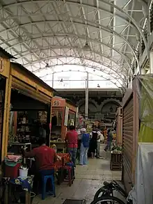 The Abelardo L. Rodriguez market has four large entrances on República de Venezuela, República de Colombia, Del Carmen and Rodríguez Puebla streets respectively.[1] One unusual feature of the building is the metal roof that covers the central patio area. Its most distinctive service is the Teatro del Pueblo (Theatre of the People) auditorium, which is located on the upper floor.[3] A number of the services and features of this market were copied in markets built as much as twenty years later, such as the markets of La Lagunilla, Tepito and La Merced.[4]
