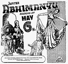 Abhimanyu is a 1948 Tamil-language film produced by Jupiter Pictures and starring S. M. Kumaresan as Abhimanyu, a character from the Mahabharatha. The screenplay was written by A. S. A. Sami, while M. Karunanidhi assisted in the script. This was the second film for Karunanidhi as scriptwriter. The film also starred M. N. Nambiar in a supporting role.[1][2][3][4][5][6]