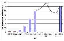 Abir collected 70 tons of dried rubber in 1895, rising to 410 tons in 1898 by which time it had eleven operational posts.[12] At the same time the price of rubber also increased from 6.30–6.50 fr per kilogram in 1894 to 8.04–10.00 fr per kilogram in 1898. Abir's costs in 1897 amounted to 0.25 fr per kilogram to purchase the rubber from the collectors (in lieu of tax), 0.4 fr for transportation, 0.25 in export duty paid to the Congo Free State and 0.45 for storage for a total cost of 1.35 fr per kilogram.[12] In the same year Abir could sell on the rubber in Europe for up to 10 fr per kilogram.[15] Abir's profits rose with the increasing quantity and price of rubber, for the first two years (1892–94) the company recorded a total profit of 131,340 fr, this had increased almost twentyfold by 1898 when they recorded a 2,482,697 fr profit just for one year.[16] As a result, the dividend paid in 1898 was 1,100 fr per 500 fr share.[17] These profits were made in spite of increasing costs due to the doubling of export duty in 1892 and the construction of the Leopoldville-Matadi railway in 1894 which increased the cost of moving rubber to the coast to 0.63 fr per kilo, more than the entire trip to Antwerp had taken in 1892.[10]