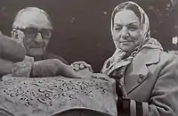Sadighi and his wife, Qodrat-ol-saadaat Mirfenderesky in Ferdowsi Square beside the statue of Ferdowsi