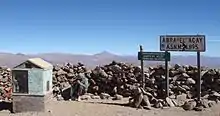 The Abra del Acay in La Poma Department, Salta Province, Argentina is the highest point in Argentina's National Route 40. Located at 24°23′S 66°14′W / 24.383°S 66.233°W, its altitude is 4,972 meters (16,312 ft),[1] even though an old sign informs visitors it stands at 4,895 meters (16,060 ft).