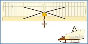 The pilot's unenclosed seat was immediately in front of the central support structure, at the centre of the wing, with his feet on a rudder bar ahead of the leading edge. The Abrial landed on a skid, with little wheels under the wing tips.[1]