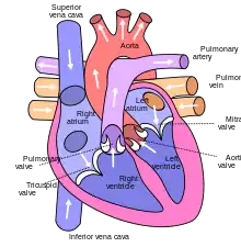 | Diagram of the human heart, with labels for chambers, valves, and blood vessels. | |