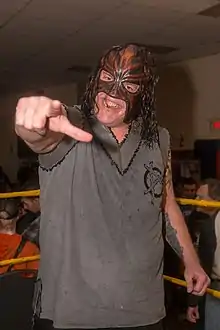 The latter ended in a loss when Abyss's "therapist", Dr. Stevie, interfered in the match, by attacking Abyss when he was on the verge of using weapons against Morgan.[2] Dr. Stevie had appeared in many therapy segments with Abyss up to that point, in which he would attempt to help Abyss get over his addiction to violence; sometimes going as far as to beat him.[2] At the following pay-per-view, Sacrifice, Dr. Stevie booked the first ever Knockout's Monster's Ball match, in which Abyss would be in the corner of Daffney, another patient of Stevie's, opposite Taylor Wilde, the best friend of Abyss's "girlfriend", Lauren. Abyss turned on Dr. Stevie after the match, after Stevie first told him to attack Wilde and then threatened Lauren, at which point he grabbed Dr. Stevie and chokeslammed him onto a pile of tacks.[2] Abyss went on later to team up with Taylor Wilde at Slammiversary to defeat Raven and Daffney in the first ever mixed tag team Monster's Ball match.[2] Over the following month the feud between Abyss and Dr. Stevie continued, with Stevie kidnapping Lauren and shocking Abyss with a taser.[2] At Victory Road, Abyss came to the ring in a new costume, having discarded the Asylum patient attire. Abyss went on to defeat Dr. Stevie by hitting a Shock Treatment, a Black Hole Slam and by shocking Stevie with his own taser.[2] On the July 30 episode of Impact! enraged Stevie announced that he was not done with Abyss and placed a $50,000 bounty on his head.[2] After Lethal Consequences and Jethro Holliday tried and failed to collect the bounty, Kevin Nash successfully defended his TNA Legends Championship against Abyss at No Surrender and claimed the $50,000 bounty in the process.[20] On the September 24 episode of Impact! Abyss's mentor Mick Foley turned on him during and after a TNA World Tag Team Championship match against Booker T and Scott Steiner.[2] Foley revealed Abyss as the one who tore up his picture and beat him to a bloody pulp with a video tape and the baseball bat wrapped in barbed wire.[2] Abyss then challenged Foley to a Monster's Ball match which Foley accepted, but only after adding Dr. Stevie as the referee of the match.[21] At Bound for Glory Abyss defeated Foley in the Monster's Ball match after counting the pinfall with the hand of the unconscious Dr. Stevie.[22] Two weeks later Abyss defeated Dr. Stevie via pinfall.[2] After the match Dr. Stevie attacked Abyss with a kendo stick when Mick Foley came to the ring to assist Dr. Stevie. Foley had Stevie hold up Abyss while Foley aligned himself up with a shot at Abyss with a kendo stick when Foley intentionally hit Dr. Stevie instead. Foley walked up the ramp without any reasoning for assisting Abyss.[23] The following week, Foley explained that he had played Dr. Stevie all along and had challenged Abyss to a match at Bound for Glory in order to test how tough he really was, seemingly returning to being a face. Afterwards Foley booked a match between Abyss and Stevie for the following week with the added stipulation that if Stevie lost the match, he would have to leave TNA.[24] On the November 12 episode of Impact! Raven returned to TNA, saved Stevie's future in the company, by costing Abyss a match against him and threw a fireball on Foley's face.[25] During Abyss and Foley's feud with Stevie and Raven TNA shot an angle, in which Stevie set Abyss on fire, that Spike wouldn't let them air on the channel and therefore had to be aired on the company's website.[2] At Final Resolution Abyss and Foley defeated Stevie and Raven in a "Foley's Funhouse" tag team match to end the feud.[26]