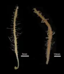 This genus is characterized by its unique teeth-like structures called abyssochelae, although they are not present in every species. Types of microscleres could also include cleistochelae, arcute chelae, and/or sigmacistras.[1] Their general morphology can be divided into two groups. The first group has a long peduncle and round top. The second group is feather-like with a shorter peduncle.[2] Both groups have straight spicules and are covered in a layer of soft tissue with sticky microstrongyles protruding perpendicularly from the body, used to capture prey.[1] Sizes of these organisms can vary from a few millimeters to several centimeters tall and just a few millimeters wide. Their thin skeleton and soft tissue can make these sponges very fragile.[3]