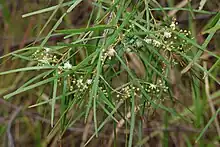 Acacia acrionastes is a spindly, glabrous shrub or tree that typically grows to a height of 2–8 m (6 ft 7 in – 26 ft 3 in). It has linear phyllodes that are 60–190 mm (2.4–7.5 in) long and 2–5 mm (0.079–0.197 in) wide and often narrower towards the tip. The flowers are arranged in a raceme 20–45 mm (0.79–1.77 in) long with 10 to 16 heads on a peduncle 3–6 mm (0.12–0.24 in) long, each head with 12 to 16 creamy yellow flowers. Flowering mainly occurs between July and August and the fruit is a leathery pod up to 100 mm (3.9 in) long and 8–10 mm (0.31–0.39 in) wide, containing up to nine seeds with a shiny black, club-shaped aril.[2][3][4][5]