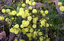 The shrub has an erect to decumbent habit and typically grows to a height of 0.3 to 1 m (1 ft 0 in to 3 ft 3 in)[2] and has ribbed stems that are covered in stiff short hairs. The phyllodes are fine and prickly with a length of 5 to 12 mm (0.20 to 0.47 in) and a width of 0.5 to 1 mm (0.020 to 0.039 in) and have four veins that are usually bent downwards.[3] It blooms between August and November and produces inflorescences with pale yellow flowers.[2] Each inflorescence occurs a one to three spherical flowers on individual stalks found in the leaf axils. After flowering narrow seed pods form that are straight or shallowly curved to with a length of around 6 cm (2.4 in).[3]