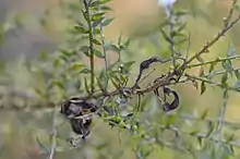 The bushy and prickly shrub typically grows to a height of 0.4 to 1.5 metres (1 to 5 ft)[3] with an erect or decumbent habit. The branchlets are terete with fine ridges and light to densely hairy. The sessile phyllodes have an ovate to lanceolate or elliptic shape and are 0.8 to 1.5 centimetres (0.31 to 0.59 in) in length and 2 to 4 millimetres (0.079 to 0.157 in) wide.[1] It blooms from July to October and produces yellow flowers.[3] The simple axillary inflorescences have globose heads containing 12 to 18 bright yellow flowers and have a diameter of 4 to 6.5 mm (0.157 to 0.256 in). Following flowering curved to twisted seed pods form with a length of 3 to 7 cm (1.2 to 2.8 in) and are 3 to 5 mm (0.118 to 0.197 in) wide.[1]