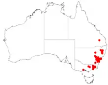 It is found along the Great Dividing Range in western parts of New South Wales, Queensland and Victoria where it is often a part of dry sclerophyll forest or open woodland communities[3] on rocky slopes and creek banks[2] growing in rocky soils.[3] The bulk of the population has a discontinuous distribution from around Walcha in the north down to the upper reaches of the Snowy River north-eastern Victoria.[2]