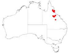 It has a disjunctive distribution and is located in Occurs Petford, Herberton and Mount Garnet areas and the Lolworth and Great Dividing Range at the headwaters of Torrens Creek and the Cape River in North Queensland with another population found about 300 km (190 mi) further south in the Cudmore National Park. It is usually situated in elevated areas that are around 500 m (1,600 ft) above sea level growing in shallow sandy soils with a sandstone base as a part of woodland communities along with Corymbia trachyphloia and Acacia shirleyi. It is also occasionally found along sandy banks of minor watercourses at lower elevations.[1]
