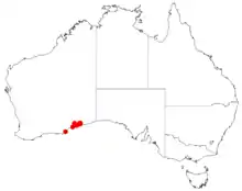 It is native to an area along the south coast of the Goldfields-Esperance region of Western Australia east of Cape Arid into the western parts of the Nullarbor Plain, where it is found on dunes and limestone rises growing in sandy to clay-loamy soils.[1] The range is mostly between Caiguna and Cocklebiddy, with one population near Israelite Bay.[2]