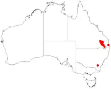 The species is native to an area of south west Queensland and found in the Darling Downs around the towns of Chinchilla, Tara, Cecil Plains and Karara. A population of around 100,000 individual trees were estimated to inhabit the surround state forests. The shrub is often part of the understorey in low woodland to open forest communities.[2]