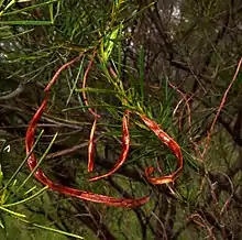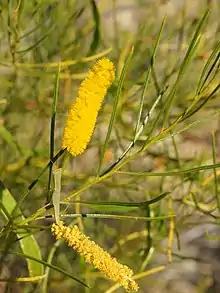 The resinous multi-stemmed shrub has a spreading habit that typically grows to a height of 4 m (13 ft) and has minni ritchi style bark. It has angular, purplish brown or red-brown coloured branchlets that are minutely crenulated with slightly appressed-villous ridges.[2] It flowers between May and August producing golden flower spikes with a length of 13 to 28 mm (0.51 to 1.10 in). After flowering it produces linear, flat seed pods that are constricted between the seeds. The pods have a length of 2.5 to 14 cm (0.98 to 5.51 in) and have pale margins. The dark brown to black seeds within the pods have a narrowly oblong to elliptic shape and have a length of 3.6 to 4.5 mm (0.14 to 0.18 in).[2]