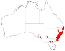 It is found down the east coast of Australia from around Kingscliff in the north of New South Wales down to around Eden in the south and inland to around Wagga Wagga in the west. Its range also extends into the eastern highlands region of Victoria although it has become naturalized in a few other localities in Victoria.[3] It is usually situated along watercourses and swamps[2] growing in sandy soils as a part of Eucalyptus or heathland communities.[1]