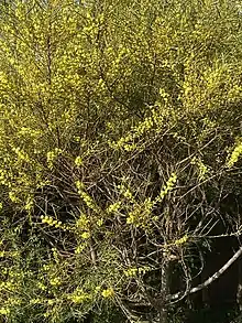 The shrub or small tree typically grows to a height of around 1 to 7 m (3 ft 3 in to 23 ft 0 in) and has an upright and open habit with hairy, yellow-ribbed angular branchlets. Like most species of Acacia it has phyllodes rather than true leaves. The glabrous, thinly coriaceous and evergreen phyllodes have a narrowly linear or occasionally linear-oblanceolate shape are usually mostly incurved. The phyllodes are 4 to 17 cm (1.6 to 6.7 in) in length and 1 to 7 mm (0.039 to 0.276 in) wide and have three raised distant nerves.[3] It blooms between July and October producing inflorescences that appear in groups of one to three, or sometimes as many as seven, on an axillary axis that is 1 to 15 mm (0.039 to 0.591 in) in length. Sometimes these will appear in the axils of the phyllodes. The spherical flower-heads have a diameter of 5 to 10 mm (0.20 to 0.39 in) and contain between 20 and 40 lemon yellow to bright yellow coloured flowers.[1] Following flowering it produces straight, thinly leathery to firmly papery, brittle seed pods that are flat but are raised over each of the seeds. The pods are 3 to 11.5 cm (1.2 to 4.5 in) in length and 3 to 5 mm (0.12 to 0.20 in) wide with sparsely distributed hairs.[1]